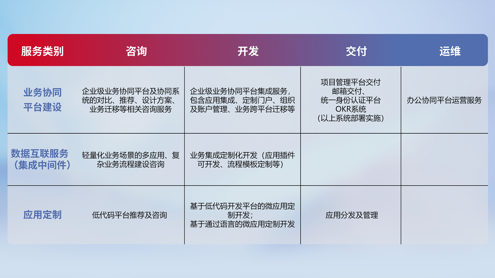 针对钉钉、、、企微、、、、IDaas等平台级产品提供产品的规划、、、、方案、、、交付、、、、定制化开发等服务,,,,实现如统一协同办公、、、智能客户服务、、、混合会议管理、、、智能数据查询、、、、等业务场景,,,实现数字化转型。。。。